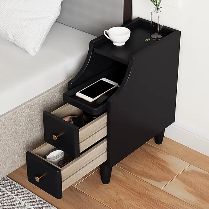 This bedside table features a smart multi-level storage design, including a top surface, a middle open shelf, and two spacious drawers. The top is ideal for placing essentials like your phone, lamp, or cup, while the shelf provides quick access to frequently used items.