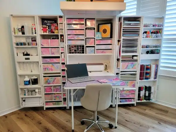 This cabinet features multiple compartments, drawers, and adjustable shelves, allowing you to neatly organize everything from fabrics, tools, papers, threads, and accessories to small craft supplies. The transparent storage bins and categorized sections ensure that every item has its place and is easy to access.